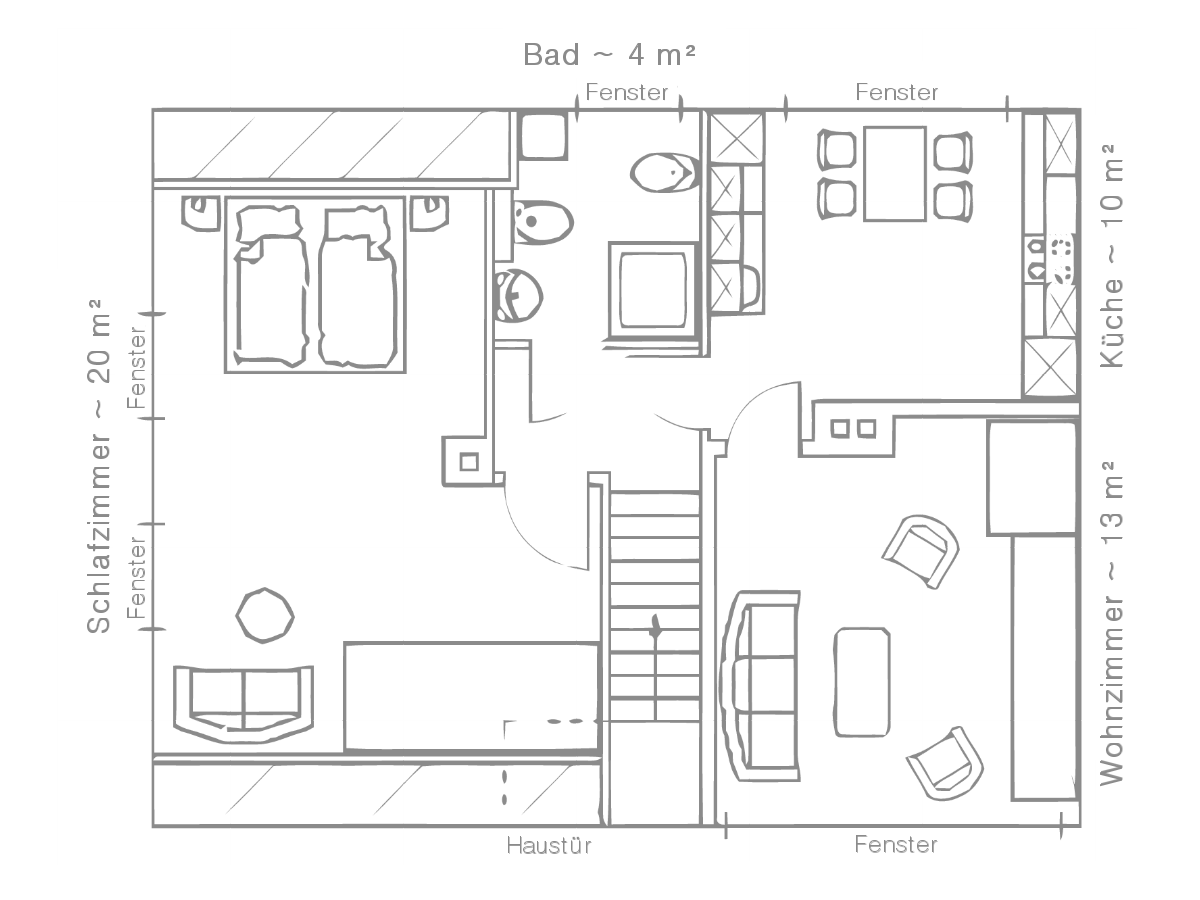 Die Ferienwohnung bietet Schlafplatz bis vier Personen ( 2 Erwachsene + 2 Kinder ). Das Schlafzimmer ist ausgestattet mit einem Doppelbett (180×200), sowie einer Schlafcouch (135×200). Im Wohnzimmer befindet sich eine Doppelbettcouch (160×200).